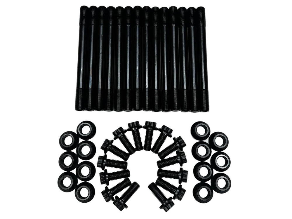 This kit is specifically designed for 24V Common Rail 5.9L engines equipped with the factory block stiffener/girdle. It includes (14) heavy-duty 10mm bolts to secure the girdle to the block, as well as shorter 12mm main stud nuts to provide the necessary clearance for the factory girdle.