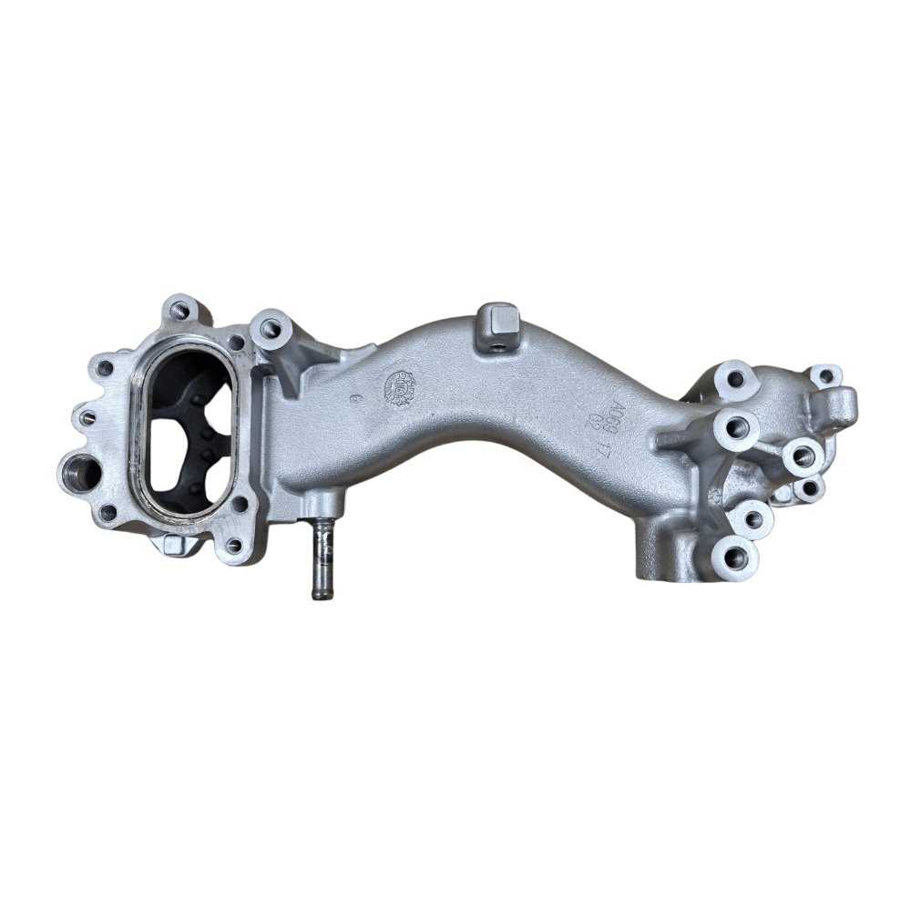 This is the thermostat housing for the main cooling system on the 6.7L Powerstroke. On this engine, the thermostat housing is a complex manifold that manages coolant flow and often includes multiple sensor ports. It mounts on the engine and is the connection point for the upper radiator hose and the coolant bypass system.
