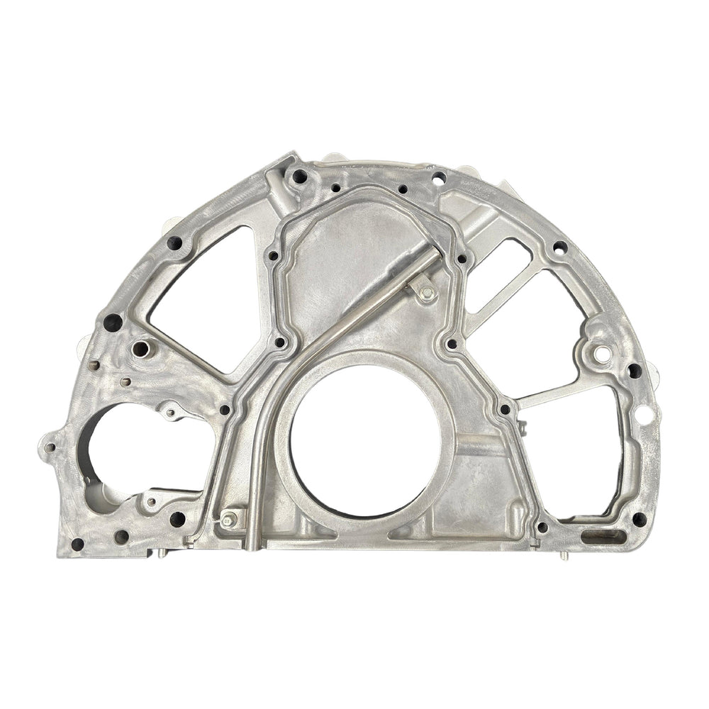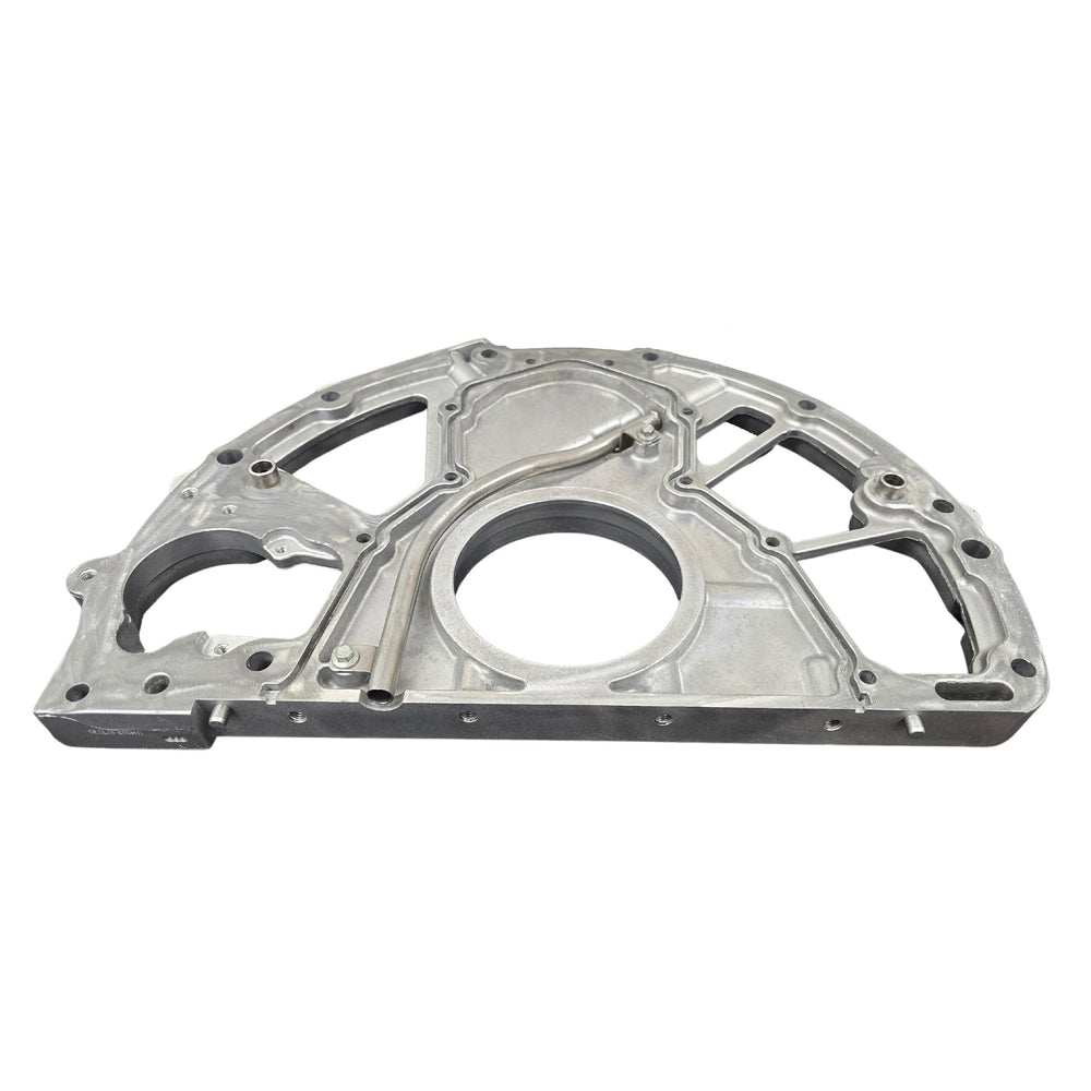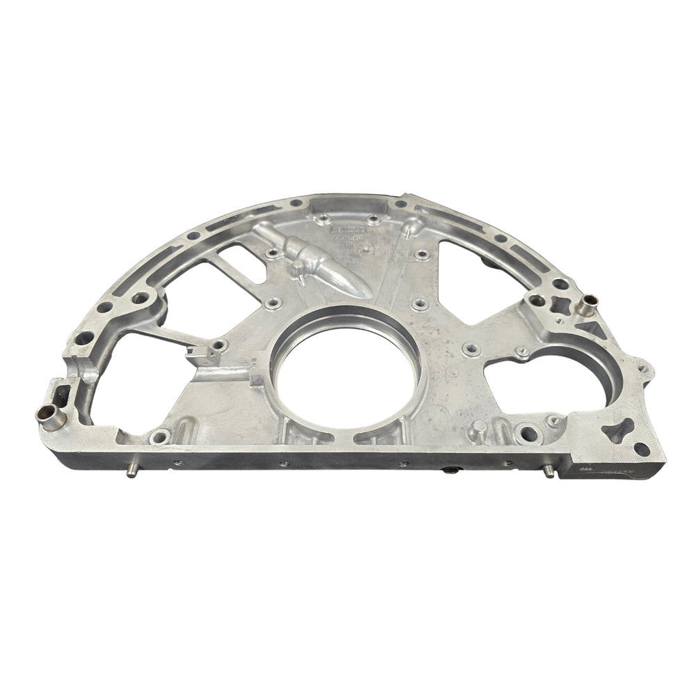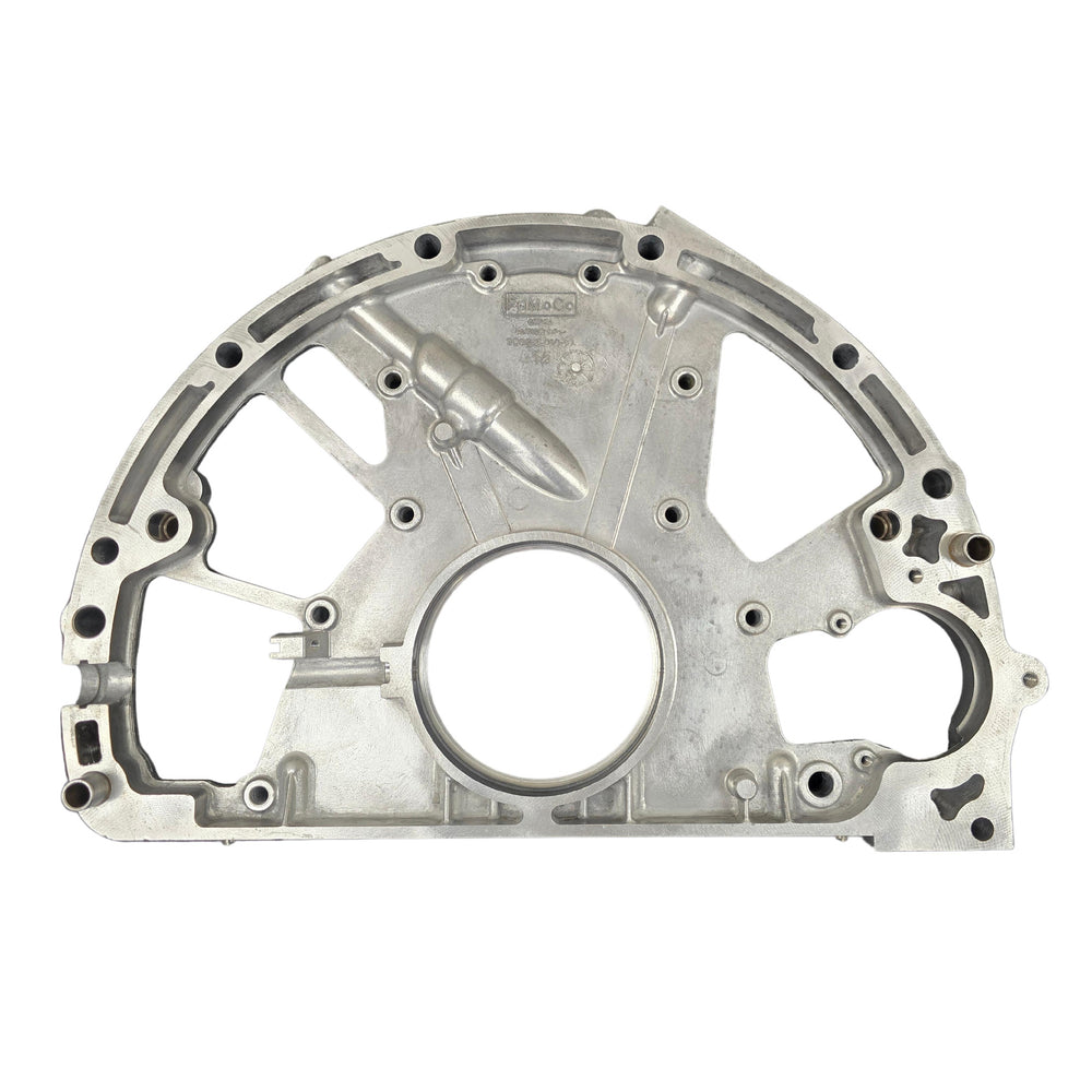 This is the critical rear engine cover for the 2011-2019 6.7L Powerstroke "Scorpion" diesel engine. Located at the rear of the engine block, this component is essential for sealing the crankcase where the transmission mounts. It houses the Rear Main Seal (RMS) and provides the mounting surface for the Crankshaft Position (CKP) Sensor and the starter motor.